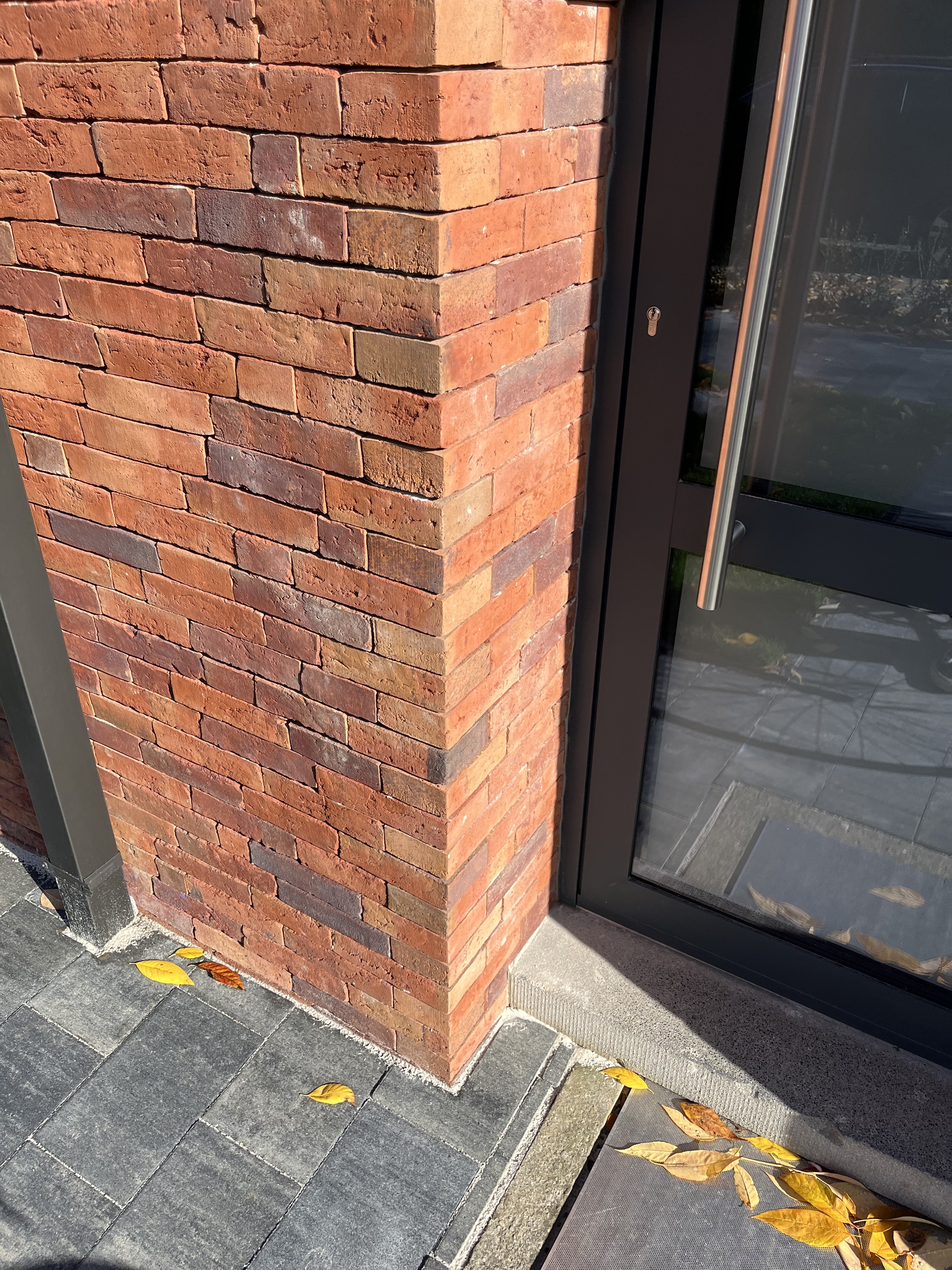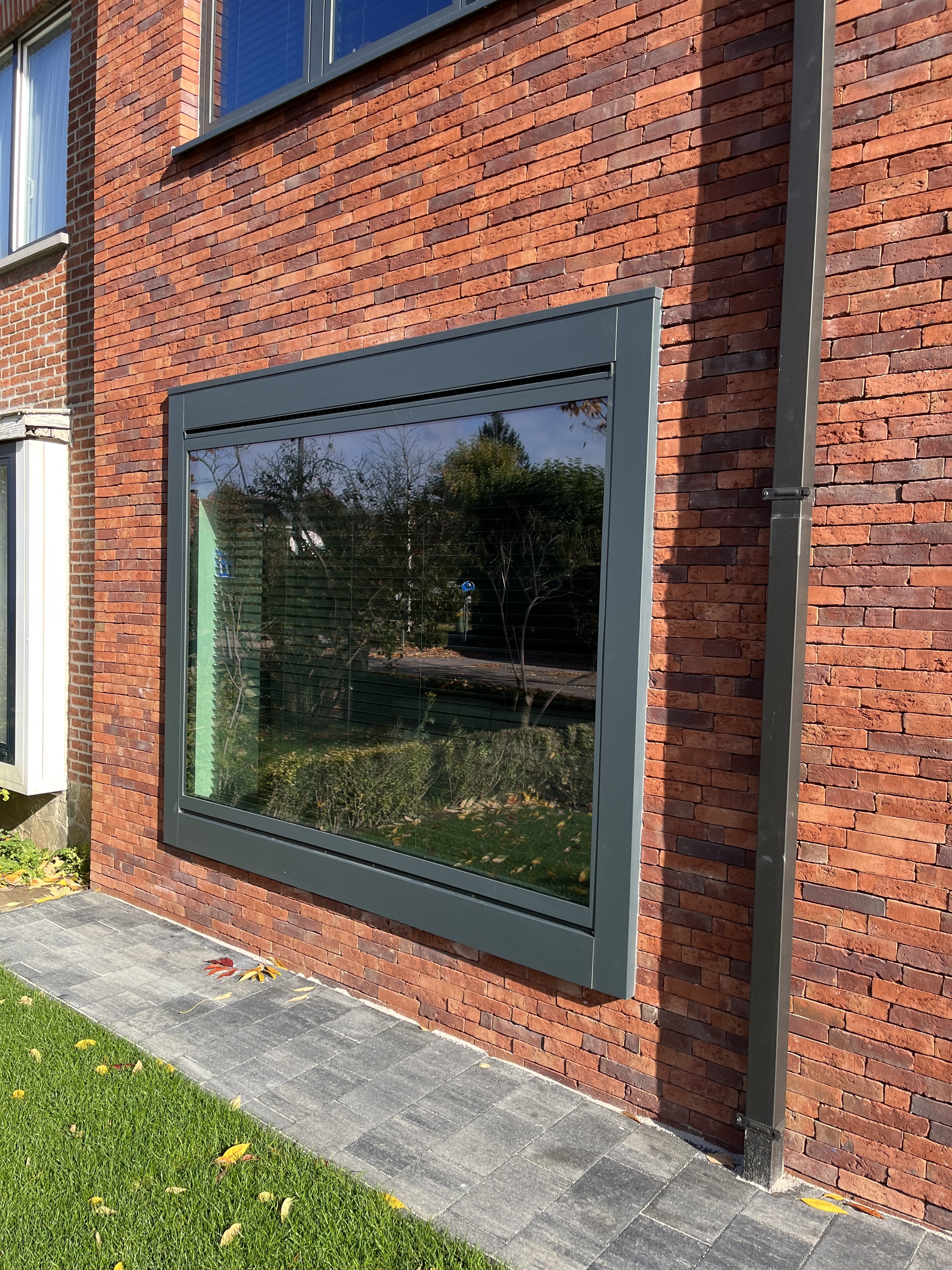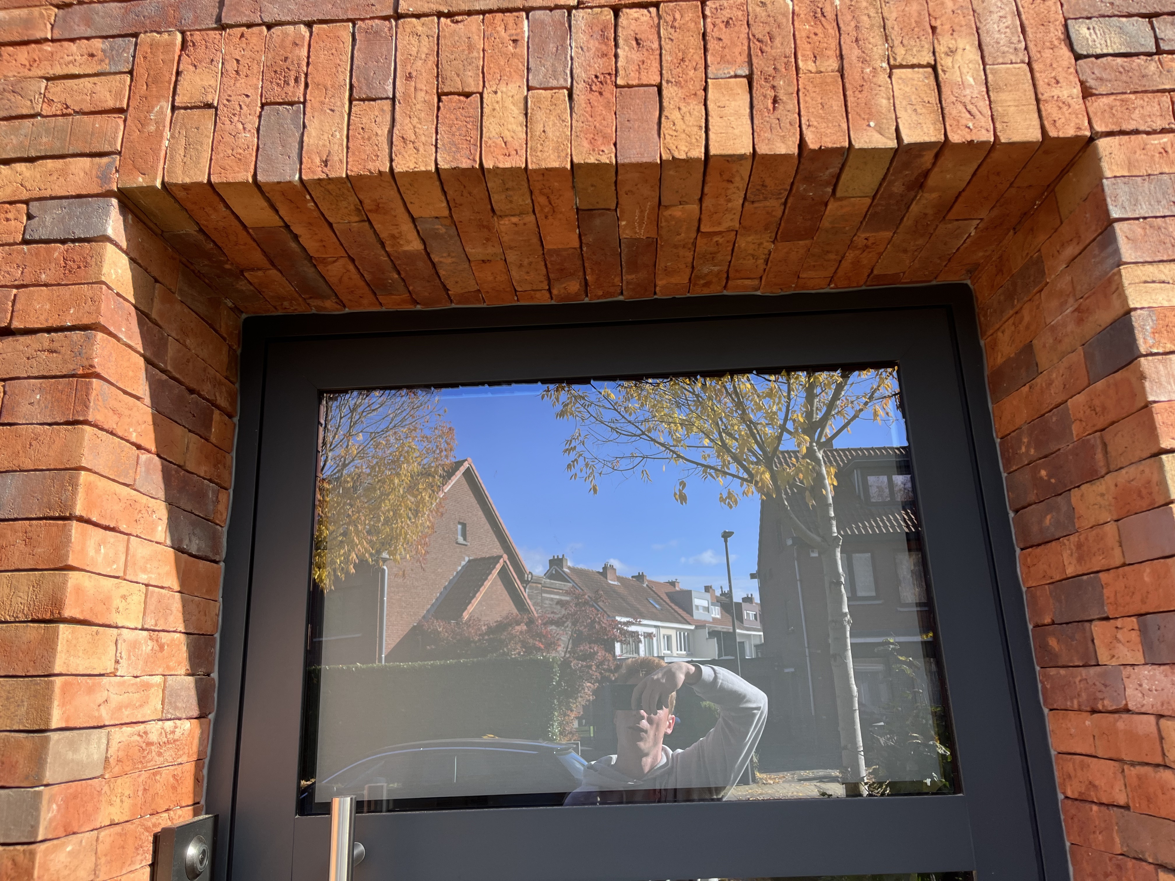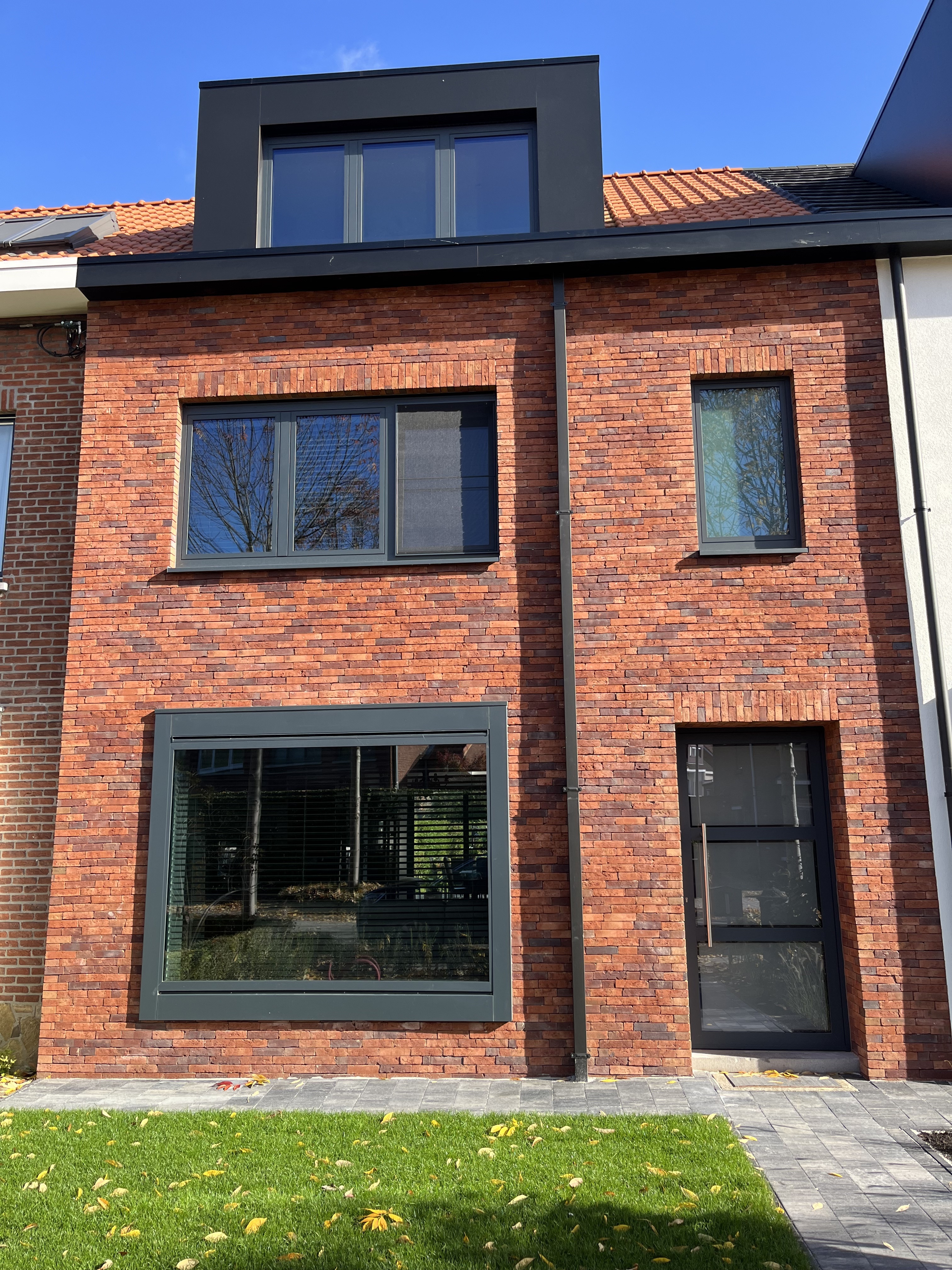 De voorgevel werd geïsoleerd met 14 cm isolatie om de energie-efficiëntie van de woning aanzienlijk te verbeteren. Vervolgens werd deze afgewerkt met steenstrips in een gelijmde look, wat de woning een moderne en strakke uitstraling geeft. Deze afwerking combineert de robuuste uitstraling van baksteen met de moderne techniek van verlijming, waardoor het geheel niet alleen esthetisch aantrekkelijk is, maar ook duurzaam en onderhoudsvriendelijk.